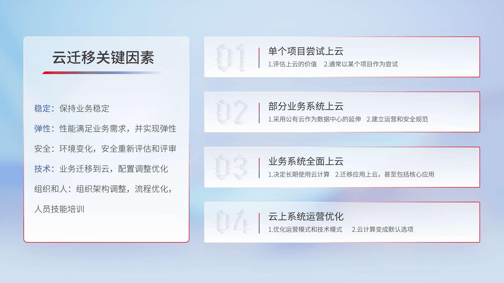 结合实际业务,,,从规划设计、、、、云平台选型、、、、云原生改造、、、数据迁移、、、、集成交付,,,,迁移全过程为客户识别最佳上云路径,,,,做好风险识别管理,,设计网络架构、、、身份权限、、、、安全审计合规、、、、操作审计、、日志审计、、监控告警策略、、多站点容灾设计等,,,对云上基础设施进行整体规划,,提升IT治理水平,,,以满足弹性、、、高可用、、、、高性能的需求。。。。