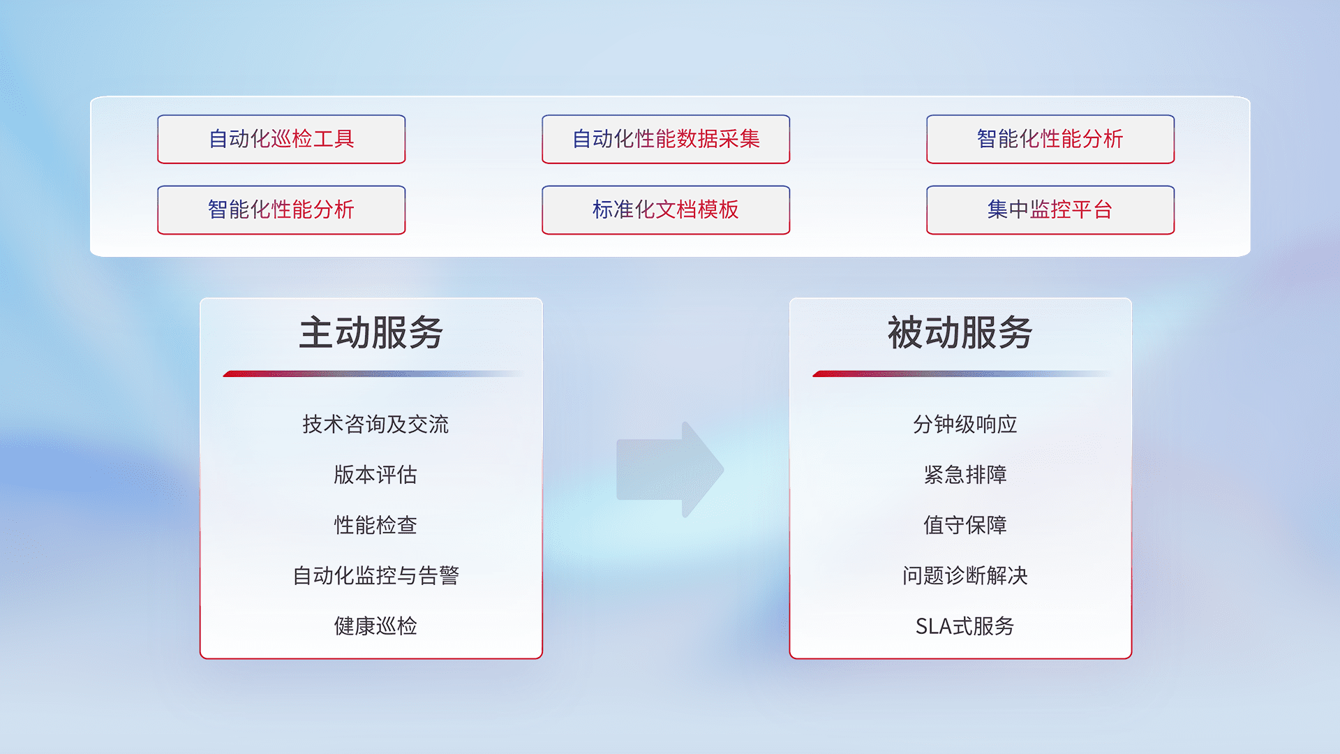 智能化工具和标准化文档,,,保障服务质量,,提供主动服务(包含技术咨询、、、版本评估、、性能检查、、、自动化监控与告警、、、健康巡检)和被动服务包含(分钟级响应、、紧急排障、、、值守保障、、、、问题诊断解决、、SLA服务)。。。。
